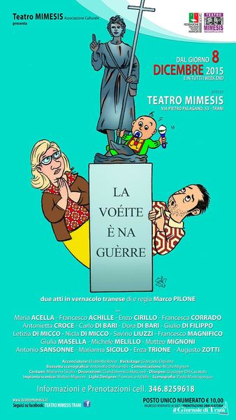 Tutti i fine settimana, fino a gennaio 2016, presso il teatro Mimesis, in via Pietro Palagano 53, l'omonima associazione culturale porterà in scena lo spettacolo "La voéite è na guèrre". Si tratta di due atti in vernacolo tranese diretti da Marco Pilone. Per informazioni e prenotazioni si può telefonare al numero 3468259618. Posto unico numerato dieci euro. Ingresso riservato ai soci. Prenotazione obbligatoria al numero di telefono o sul sito internet. Prossima rappresentazione oggi, domenica 27 dicembre, alle 21.