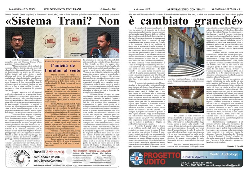 Sul Giornale di Trani è comparso un articolo dal titolo “Sistema Trani? Non è cambiato granché”. Riporta un’intervista di due consiglieri comunali, uno di maggioranza (Tommaso Laurora) e uno di opposizione (Giuseppe Corrado), che lamentano una certa ‹‹continuità con il passato›› con riferimento ad una situazione clientelare che ad oggi ‹‹non è cambiata››.