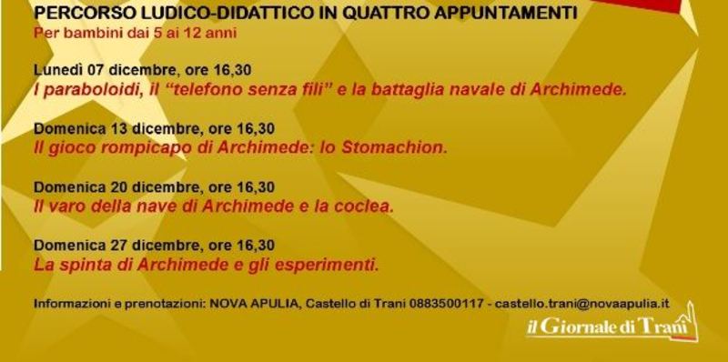 Continua con successo al castello di Trani “Archimede, un genio tra noi”, la mostra che ripercorre la vita di Archimede e permette di “toccare con mano” le sue idee straordinarie, un viaggio tra storia e leggenda alla scoperta delle ricerche che lo hanno reso celebre: dall’idrostatica alla meccanica, dalla geometria alla matematica.