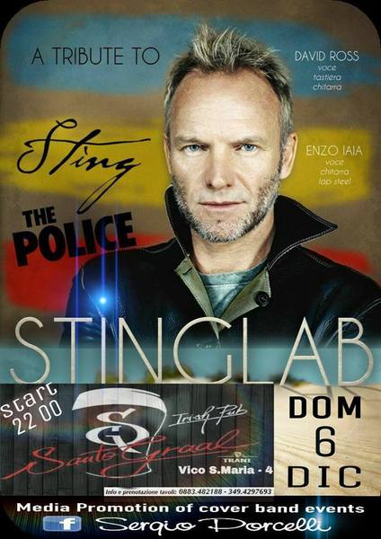 Gli STINGLAB sbarcano a Trani, nella bellissima cornice del Santo Graal con il repertorio che ha reso celebre l'artista inglese. I più bei successi di Sting & Police, rivisitati in chiave acustica!!!! ENZO IAIA voce e chitarra lap steel DAVID ROSS voce tastiera e chitarra SANTO GRAAL VICO SANTA MARIA 4 TRANI ingresso libero info e pren tavoli 349 4297693 0883482188