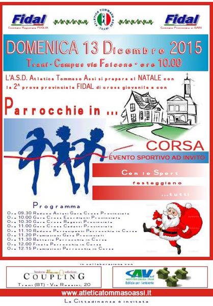A seguire, alle 11.30 circa, prenderà il via la manifestazione “Parrocchie in …Corsa” con i ragazzi e ragazze di 9 e 10 anni delle parrocchie della Città di Trani che si avvicineranno al mondo dell’atletica in modo festoso ed allegro.