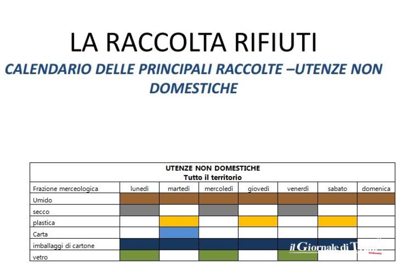 Per le utenze non domestiche, in tutto 2771, l’umido sarà raccolto tutti i giorni (anche la domenica); il secco ed il vetro lunedì, mercoledì e venerdì; la plastica il martedì, il giovedì ed il sabato; gli imballaggi di cartone tutti i giorni, domenica esclusa. Per il porto di Trani, essendo area a vocazione turistica, con un elevato numero di ristoranti che hanno poco spazio all’interno dei locali e pertanto necessitano di conferire i rifiuti più volte durante l’arco della giornata, sono stati previsti, oltre che i turni ordinari, due ulteriori giri quotidiani di raccolta: domiciliare pomeridiana e in prossimità notturna.