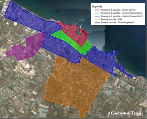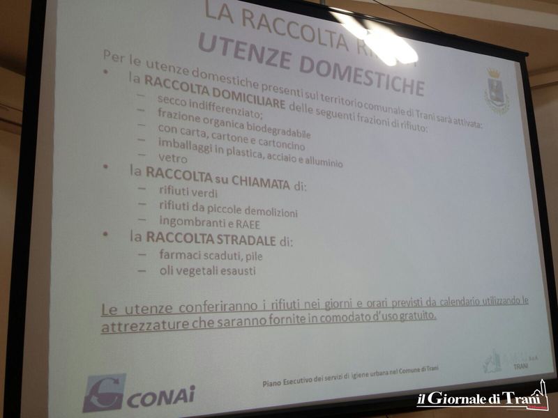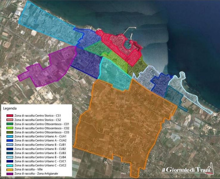 Per le utenze domestiche presenti sul territorio saranno attivate le raccolte: domiciliare, a chiamata, stradale. La raccolta domiciliare sarà fatta per le seguenti frazioni di rifiuto: secco indifferenziato, frazione organica biodegradabile, carta cartone e cartoncino, imballaggi in plastica, acciaio ed alluminio, vetro. La raccolta su chiamata sarà fatta per i rifiuti verdi, i rifiuti di piccole demolizioni, ingombranti e rifiuti di apparecchiature elettriche ed elettroniche. Per i farmaci scaduti, le pile, gli oli vegetali esausti è prevista invece la raccolta stradale. Per favorire il dimensionamento dei servizi, il comune di Trani è stato suddiviso in cinque macro-aree omogenee di raccolta: il centro storico allargato (riguarderà 2637 famiglie, ovvero 6464 persone); il centro ottocentesco (5125 famiglie, 13250 unità); il centro urbano (il più popoloso, con 10703 famiglie e 31027 persone); la zona delle ville (714 famiglie, 2070 persone); case sparse (102 famiglie, 255 persone) per un totale di 19281 famiglie e 53066 persone. Ciascuna di queste aree è stata a sua volta distinta in subzone: centro storico CS1 – CS2; centro ottocentesco CO1 – CO2 – CO3; centro urbano A CUA1 – CUA2, centro urbano B CUB1 – CUB2 – CUB3 – CUB4, centro urbano C CUC1 – CUC2. L’umido sarà raccolto il lunedì, il mercoledì e il sabato nei centri: storico, ottocentesco, urbani A, B, C, zona ville. Il secco sarà ritirato il martedì ed il venerdì nei centri: storico, ottocentesco, urbani A e B, case sparse; il mercoledì e il sabato nel centro urbano C e nella zona ville. La plastica sarà raccolta il giovedì in tutte le zone. La carta sarà ritirata il martedì nei centri: storico, ottocentesco, urbano A, B, case sparse; il lunedì nel centro urbano C e zona ville. Il vetro sarà raccolto ovunque il venerdì. Le case sparse avranno le compostiere.