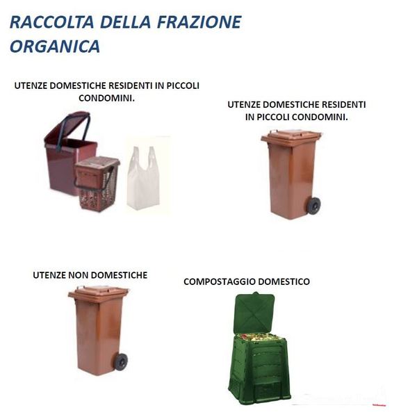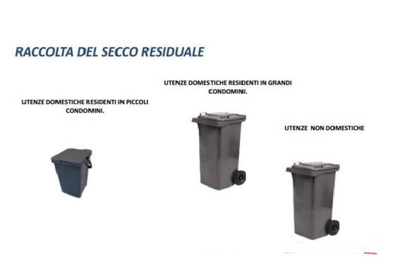 Tutte le utenze familiari residenti nell’intero territorio comunale di Trani riceveranno una dotazione completa di: un bidoncino da dieci litri di colore marrone da posizionare sotto il lavello per la raccolta della frazione organica; un bidoncino da 25 litri di colore marrone per il conferimento della frazione organica; un bidoncino da 25 litri di colore verde per il vetro; un bidoncino da circa 40 litri colore grigio per i rifiuti indifferenziati; una fornitura annua di buste da 12 litri in materiale cellulosico compostabile per la raccolta della frazione organica; una fornitura annua di buste da 40 litri in carta kraft dotate di codice a barre identificativo dell’utenza/Rfid per il conferimento dei rifiuti di carta; una fornitura annua di buste da 70 litri in polietilene semitrasparente dotate di codice a barre identificativo dell’utenza/Rfid per il conferimento della frazione multimateriale leggera. Per il conferimento dei rifiuti nei condomini in cui sono presenti più di 8 famiglie saranno distribuiti: uno o più contenitori carrellati di 120-240 litri di colore marrone per la raccolta della frazione organica; uno o più contenitori carrellati 120-360 litri di colore verde per la raccolta del vetro; uno o più contenitori carrellati 240-360 litri di colore grigio per la raccolta del secco indifferenziato. Tali contenitori dovranno essere posizionati all’interno degli spazi condominiali e posizionati all’esterno nei giorni e negli orari previsti per le raccolte. Per i condomini dotati di spazi condominiali molto piccoli si potrà optare per l’uso di un unico contenitore di colore bianco per il conferimento della frazione indifferenziata e del vetro. Per la raccolta presso utenze commerciali saranno distribuiti: un bidoncino da circa 25 litri di colore marrone o un contenitore carrellato da 120/240-360 litri per la raccolta della frazione organica; uno o più Ecobox in cartoplastica ondulata o bidoncini di colore azzurro da 50 litri tipo per il conferimento di carta, cartone e cartoncino; un bidoncino da circa 25 litri di colore verde o un contenitore carrellato da 120/240 litri per la raccolta del vetro; un bidoncino da circa 40 litri di colore grigio o un contenitore carrellato da 240/360 litri per la raccolta della frazione residuale, un contenitore carrellato da 240/360 litri per la raccolta della frazione multimateriale leggera.