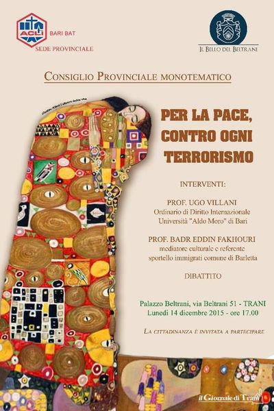 Ospiti illustri di un incontro promosso dalle Acli di Bari e Bat, incentrato sul delicato momento storico che l’umanità intera sta vivendo: Ugo Villani, professore ordinario di diritto internazionale presso l’università "Aldo Moro" di Bari, e Badr Eddin Fakhouri, mediatore culturale e referente dello sportello immigrati del comune di Barletta.