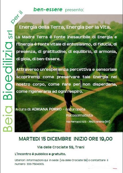 La Beia Bioedilizia s.r.l., società operante nel settore della bioarchitettura e della sostenibilità ambientale del costruito, organizza per oggi, martedì 15 dicembre, alle 19, l’evento “Energia della terra, Energia per la Vita” all’interno del suo percorso espositivo in Trani in via delle Crociate 59.
