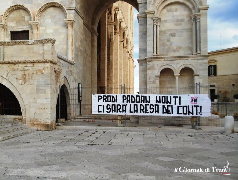 Un intervento ulteriormente motivato dalla protesta, annunciata e realizzata, degli attivisti di Forza nuova, che accusano Monti di un presunto conflitto d’interessi per la presenza del figlio nel management della Morgan Stanley, legata a Standard & Poor’s. Il sit è stato pacifico, l’ostensione dello striscione sulla recinzione del campanile della cattedrale quanto meno inopportuna: il duomo, utilizzato come bacheca politica, ancora non s’era visto.