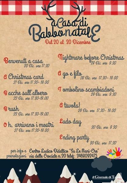 La sede dell’associazione Su le mani-che per dieci giorni si trasformerà nella vera dimora di Babbo Natale, in legno, piccola, accogliente e semplice, proprio come da tradizione: un grande camino, un albero di natale e poi tutto il suo mobilio. Niente laptop ma macchine da scrivere, niente cd: solo vinili. Una truppa di elfi, segnerà il tempo ed accompagnerà i bambini in una magica avventura alla scoperta del mondo di Babbo Natale. I bambini verranno calati in una realtà in cui non gli è tutto dovuto, ma dovranno collaborare alla preparazione del Natale con gli elfi, da soli e con i loro genitori, attraverso attività manuali che viaggeranno sempre in compagnia di filastrocche, indovinelli e racconti teatrali, giocose tappe di un fantastico viaggio all’interno della casa di Babbo Natale.