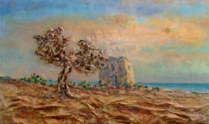 «Nell'ultimo periodo di ricerca ho realizzato delle creazioni artistiche con materiale di riuso e riciclo (carta per pacchi, cartone e polistirolo). In particolar modo rappresento paesaggi marittimi e collinari. Io cerco, plasmando carta e cartone con colla e acrilici di fermare lo scorrere repentino del tempo. Infatti la società consumistica che pervade ogni angolo del globo ha logorato e cancellato la vita serena e piacevole del passato anteponendo a tutto questo uno stile di vita frenetico, per questo motivo propongo con questo sistema esclusivo (pittura, carta e colla) scorsi tipici del territorio pugliese (trulli, campagne, torrette) che danno vita a quel forte senso di appartenenza alla terra e ad una stasi temporale che origina sensazioni profonde e indescrivibili dando valore ad ogni singolo giorno. Le opere sono leggermente in rilievo, dando quel senso del movimento, su supporto rigido e senza cornici.».