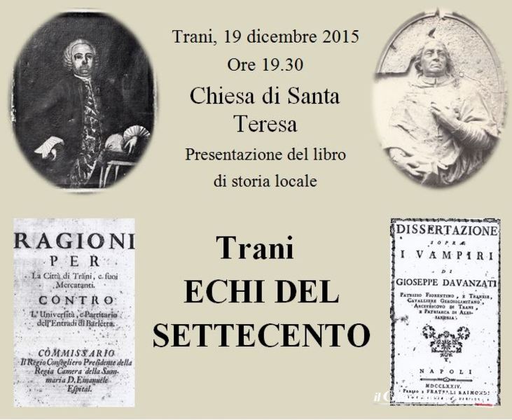 Il volume, Trani - echi del Settecento, è stato scritto da Nereo Maccon (Rocco Mennea) e Saverio Cortellino: i due autori saranno presenti all'incontro insieme a Giuseppe Poli, ordinario di storia moderna presso l'università di Bari, e don Michele Cirillo, parroco di san Giovanni.