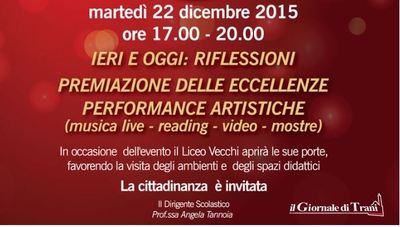 Concluderà la manifestazione una breve ma significativa cerimonia di premiazione delle “eccellenze “ del Vecchi (alle 18.30) : alunni che si sono distinti per gli esiti brillanti riportati negli esami di stato (anno scolstico 2014/15) saranno “eccezionalmente” premiati dai “primi diplomati” (anno scolastico 1964/65) del nostro liceo, oggi affermati professionisti, che interverranno per la particolare occasione.