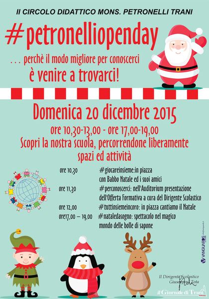 Sarà una giornata particolarmente intensa, con iniziative ed eventi per tutti, piccoli e grandi, quella in programma domenica 20 dicembre in piazzetta Petronelli. È l'edizione 2015 di #petronelliopenday, l'appuntamento organizzato dalla nostra istituzione scolastica. Per tutto il giorno in piazzetta e a scuola ci saranno musica, sport, eventi, laboratori e attività per grandi e piccini. La giornata si aprirà alle 10 in piazzetta con i giochi con Babbo Natale e i suoi amici.