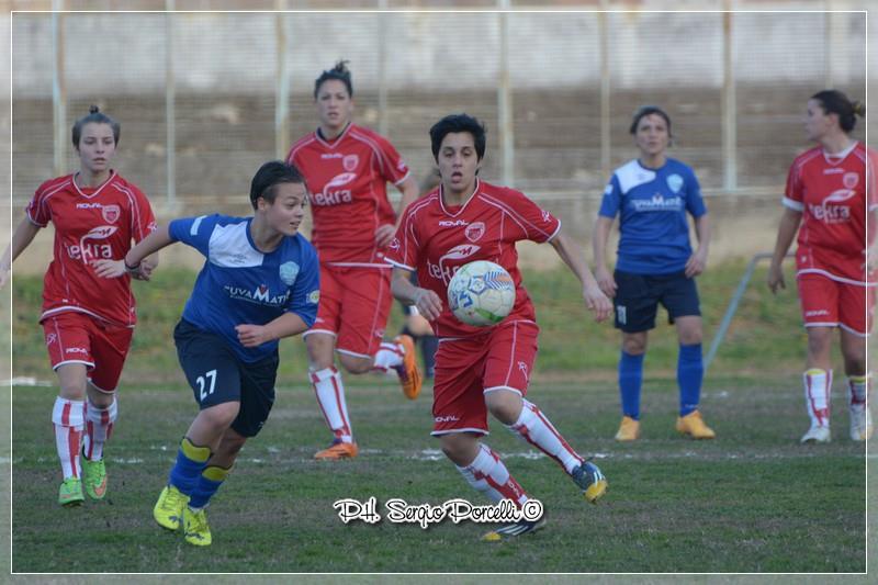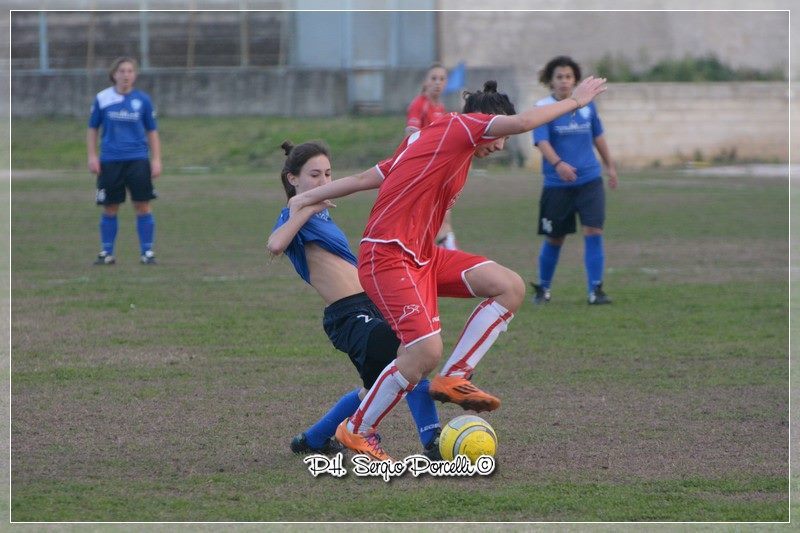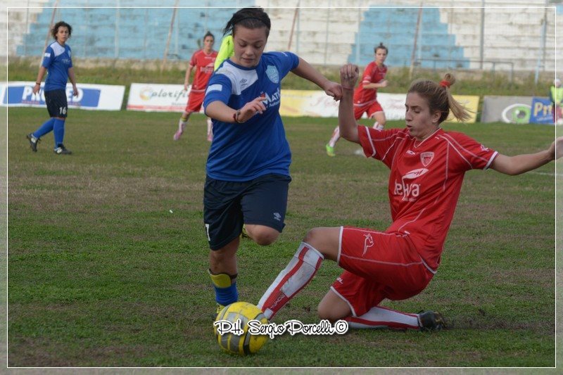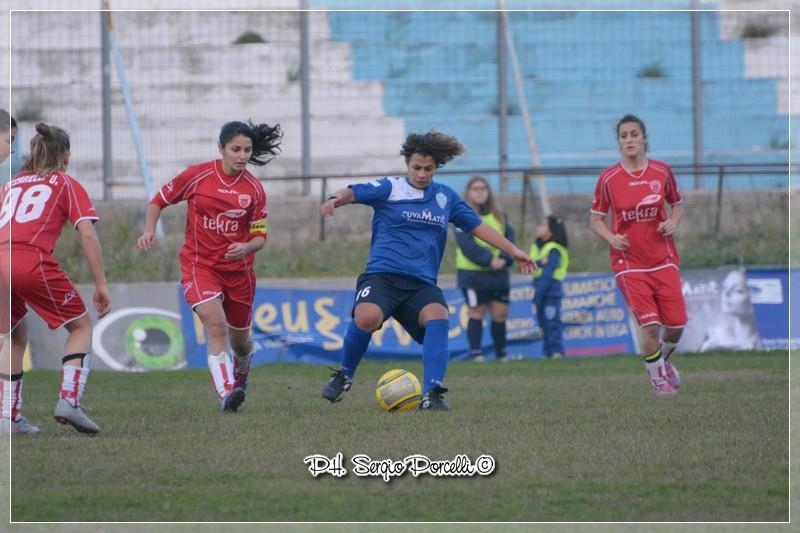 Sin dai primi minuti di gioco, la squadra ospite si rivela più spigolosa, facendo cadere sia Sgaramella che Cagiano ma permettendo anche all’Apulia di battere diversi calci di punizione, tutti affidati ai piedi di Delvecchio. Apulia che ha più e costanti occasioni: Iorio serve a Mariano un assist sul piatto d’argento nei primi dieci minuti, ma Mariano sfuma l’occasione. Diverse occasioni anche per mano di Sibiliano, che è stata tra l’altro più volte vittima degli attacchi delle avversarie, ma che disputa veramente un bel primo tempo. Sul finire, Delvecchio batte una punizione da buona posizione, ma il portiere para miracolosamente. Confusione in campo, quando Chiapperini tira in porta un gran tiro da sinistro dai trenta metri, la palla prende il palo e va sui piedi di Volpe che realizza, ma il gol viene annullato perché fuorigioco.