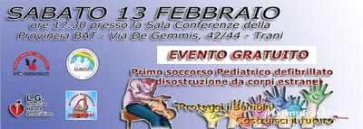 L'Aps "Gruppo Formatori Schoolbat", in collaborazione con InfoEmergency e Siaatip e Sua, con il patrocinio della Regione Puglia, Provincia di Bat, Asl Bt e Comune di Trani, organizza il primo maxi-evento, completamente gratuito ed aperto a tutti gli interessati, per apprendere le basi della disostruzione pediatrica e della rianimazione cardiopolmonare con l'ausilio del defibrillatore.