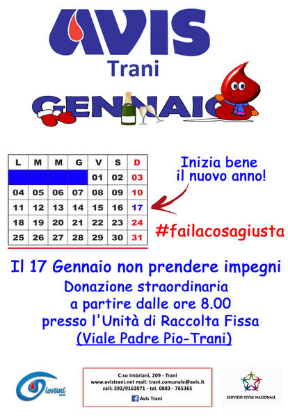 Avis di Trani organizza una donazione straordinaria di sangue oggi, domenica 17 gennaio, a partire dalle 8, presso l'unità di raccolta fissa in viale Padre Pio.