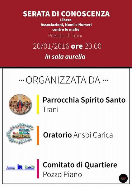 Oggi, mercoledì 20 gennaio, alle 20 in sala Aurelia, presso la parrocchia Spirito Santo di Trani, il Presidio Libera Trani, nella figura del suo presidente Michele Gallo, incontrerà il comitato di quartiere Pozzo Piano.