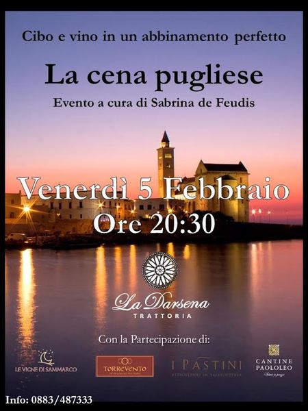 A Trani la prima settimana di febbraio è nel segno dell’eccellenza enogastronomica pugliese. Oggi, venerdì 5 febbraio, l’eccellenza enogastronomica pugliese cambia location e si sposta alla "Trattoria La Darsena", dove a coccolare i commensali ci penserà un’altra coppia gourmet: Raffaele Tempesta con la moglie e cuoca Alessia Martire. La serata avrà come obiettivo il giusto abbinamento tra il cibo e il vino rigorosamente pugliesi.