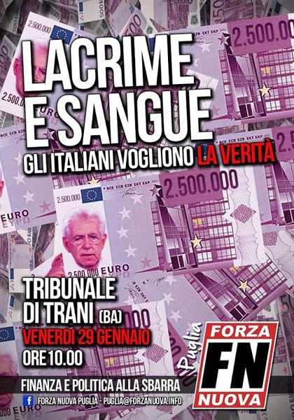 Forza Nuova sarà presente ancora una volta a Trani oggi, venerdì 29 gennaio, alle 10.30, con i propri militanti davanti al tribunale. Saremo presenti per contestare l'onorevole Mario Monti ex presidente del consiglio che è chiamato a testimoniare per il processo intentato dai Pm di Trani verso i dirigenti dell’agenzia di rating Standard & poor's che a seguito del suo giudizio fece precipitare l’Italia in una crisi profonda di cui ancora oggi paghiamo le conseguenze.