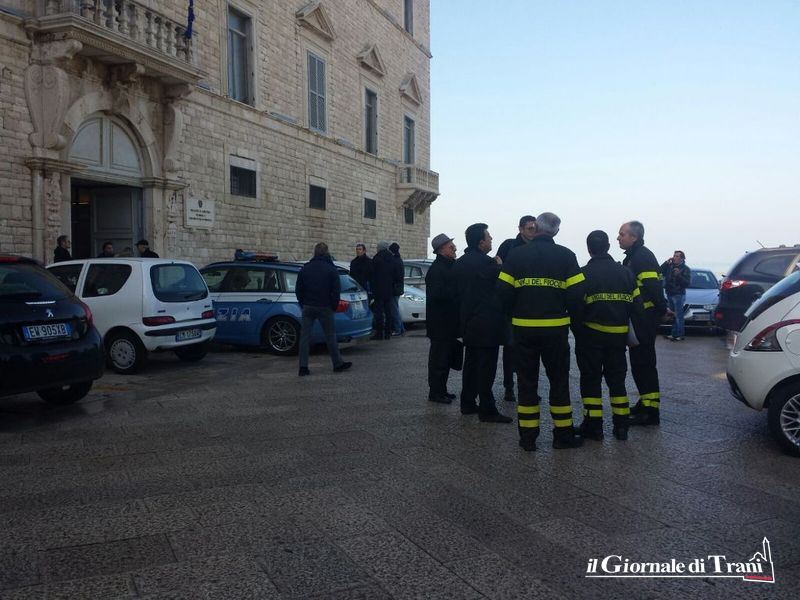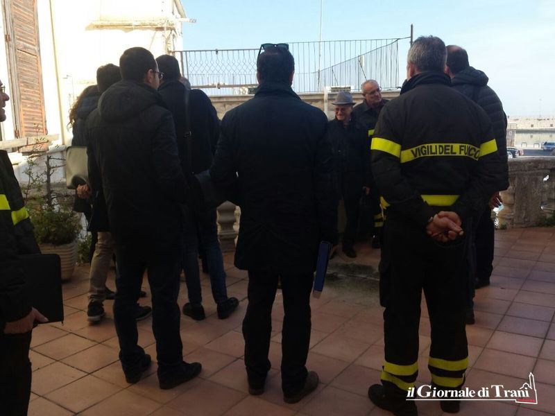 Questa mattina si è tenuto un sopralluogo congiunto al quale hanno partecipato il sindaco di Trani, Amedeo Bottaro, i sostituti procuratori Luigi Scimé e Alessandro Pesce, il dirigente comunale dell’area Lavori pubblici Giovanni Didonna, i tecnici comunali Claudio De Leonardis e Mariano Torre, il responsabile del servizio di prevenzione e protezione di tribunale e procura, Luigi Cipriani, il consulente del Comune di Trani, Nicola Ronchi, i rappresentanti dei vigili del fuoco, responsabili e dirigenti del tribunale, delle cancellerie e della procura, il comandante della Polizia locale di Trani, Leo Cuocci, il capitano della PL, Michele Ruggiero, il maresciallo Giovanni Bruno.