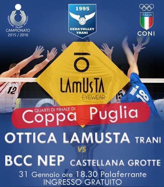 Nonostante la sosta del campionato, l'Ottica Lamusta Trani sarà ugualmente in campo. Essendo prima del suo girone, domenica sera giocherà i quarti di Finale di Coppa Puglia contro il Castellana Grotte per ottenere un posto tra le prime quattro squadre che a fine campionato giocheranno la Final Four.