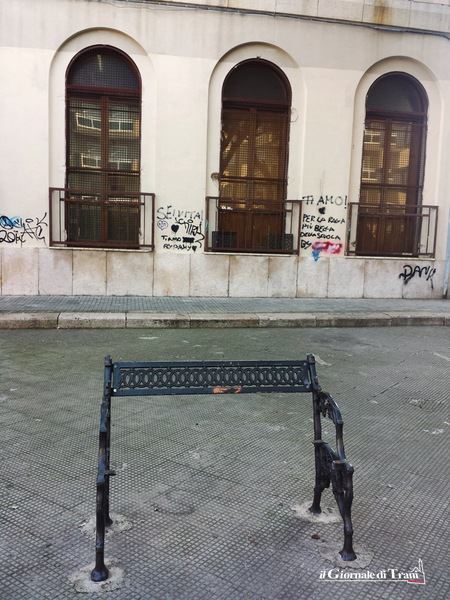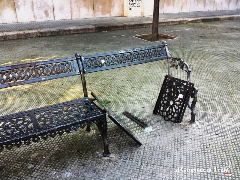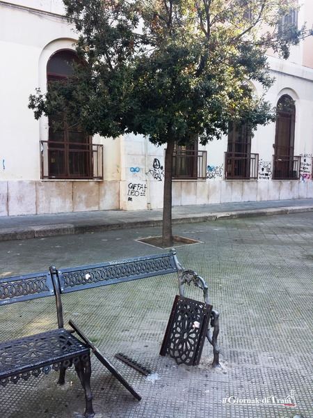 Proprio qui, davanti alla sede del Liceo De Sanctis, ben due sono state le panchine distrutte dai teppisti: la prima è rimasta con i sedili, spaccati, rivolti verso la pavimentazione; nel secondo caso i vandali hanno avuto cura di rimuovere la seduta ed infilare le due pesanti lastre in ghisa tra la ringhiera e le imposte di un balcone lungo il muro perimetrale della scuola.