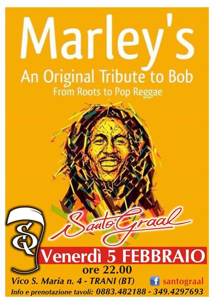 Oggi, venerdì 5 febbraio, alle 22, i Marley's (Bob Marley Mash Up Tribute) Al Santo Graal di Trani, in vico Santa Maria 4.