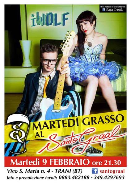 Oggi, martedì 9 febbraio, martedì grasso con IWolf al Santo graal di Trani. Lasciatevi trasportare dalla grinta e dall'ironia di questo duo energico, che proporrà uno show coinvolgente che farà cantare, ballare e divertire in diverse fasi della serata. La migliore musica italiana a colpi di chitarra, voci e loop station, in uno spettacolo che a tratti ricorderà un varietà televisivo ricco di colpi di scena, come il "momento jukebox" dove il pubblico è protagonista.
