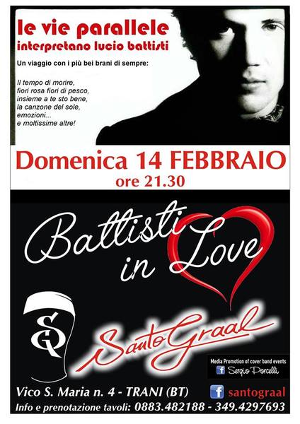 Oggi, domenica 14 febbraio, alle 21, Battisti in love, Vie Parallele Cover band di Lucio Battisti al Santo Graal Trani, in vico santa Maria 4.