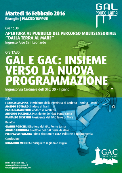 Quale sarà il futuro dei Gal e dei Gac? Quali saranno le nuove opportunità di finanziamento per il territorio? Saranno questi solo alcuni degli interrogativi a cui risponderà l’incontro, organizzato dal Gal Ponte Lama e dal Gac Terre di Mare, martedì 16 febbraio alle ore 17.30 presso il Palazzo Tupputi a Bisceglie.