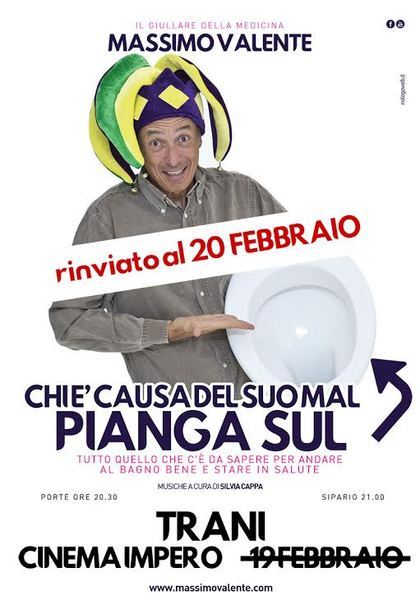 «La salute va a teatro, e lo fa con ironia»: parola dell’osteopata pugliese Massimo Valente, autore e unico interprete di questa conferenza buffa insieme a sua moglie, Silvia Cappa, che accompagna il monologo al pianoforte mentre vanno in scena tutti i consigli per stare in salute a partire dalla buona funzionalità dell’intestino.
