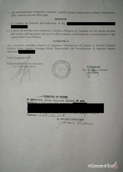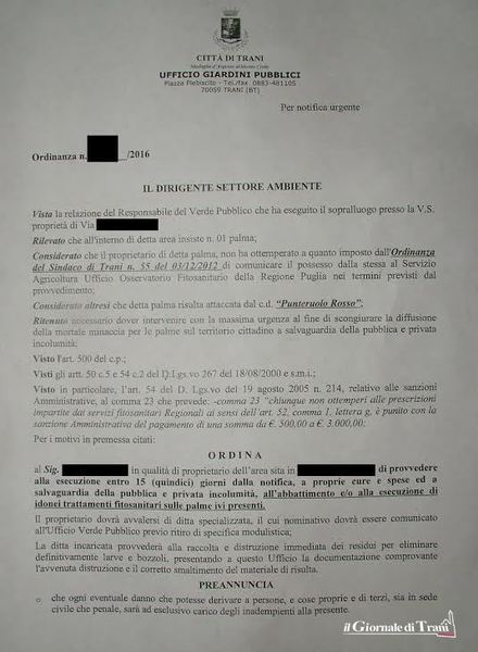 Con riferimento al grave problema dell’infestazione da punteruolo rosso che vede interessato il territorio comunale e che ha fatto strage di palme, il Comune tramite il dirigente del settore ambiente e del responsabile del verde pubblico ordina «di provvedere alla esecuzione entro 15 giorni dalla notifica, a proprie cure e spese ed a salvaguardia della pubblica e privata incolumità, all'abbattimento e/o alla esecuzione di idonei trattamenti fitosanitari sulle palme» e preannuncia che l’inottemperanza comporterà, trascorso il suddetto termine (15 giorni), l’esecuzione in danno comprensive delle sanzioni previste dalla legge. Il privato (in questo caso lo scrivente) sensibile ai problemi ambientali ottempera senza nulla eccepire essendo una ordinanza comunale e provvede mediante ditta specializzata all'eradicazione della palma in oggetto con spesa di circa 700 euro per singolo esemplare.