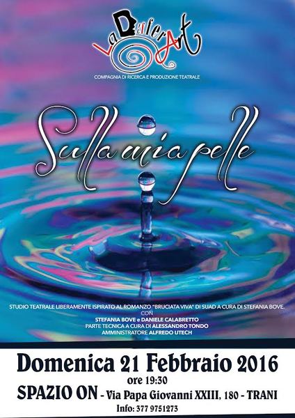 La stagione teatrale "I mulini a vento" organizzata da Marluna Teatro presenta, per oggi, domenica 21 febbraio, alle 19.30, lo spettacolo "Sulla mia pelle", liberamente ispirato dal libro “Bruciata viva” di Suad. Studio teatrale a cura di Stefania Bove, Daniele Calabretto. Produzione La DifferArt.