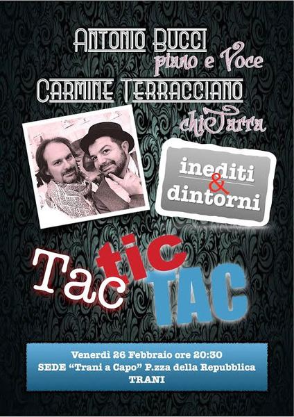 Domani, 26 febbraio, alle 20.30, nella sede del movimento civico Trani#ACapo, si terrà un concerto del duo composto da Antonio Bucci (voce e pianoforte) e Carmine Terracciano (chitarra).