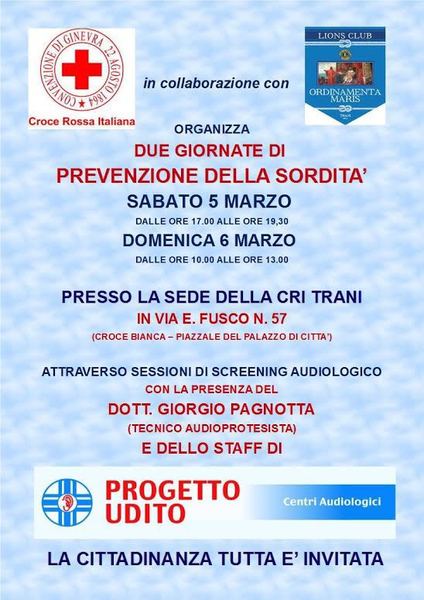 Seconda giornata dedicata alla prevenzione dei problemi dell’udito: oggi, domenica 6 marzo, presso la sede della Croce rossa italiana di Trani, in via Fusco 57, nei pressi del palazzo di città, i volontari Cri supporteranno Giorgio Pagnotta, tecnico audioprotesico, in sessioni di screening audiologico durante le quali, mettendo a disposizione le proprie strumentazioni ed i propri collaboratori, si effettueranno delle visite gratuite alla popolazione che vorrà usufruirne. Appuntamento dalle 10 alle 13.