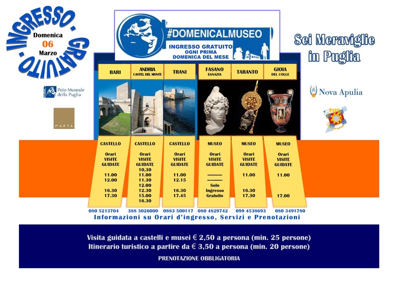Oggi, in occasione dell'iniziativa del MIBACT Domenica al Museo, con ingresso gratuito in tutti i Luoghi della Cultura statali, nei castelli svevi di Bari, Trani (BT) e Castel del Monte di Andria(BT), e nei musei archeologici di Taranto e Gioia del Colle (BA), vi attendono le guide turistiche di Nova Apulia - abilitate e accreditate presso le competenti Soprintendenze, il Polo Museale della Puglia e il MARTA di Taranto - per accompagnarvi nella scoperta della storia e delle bellezze di questi sei meravigliosi luoghi.