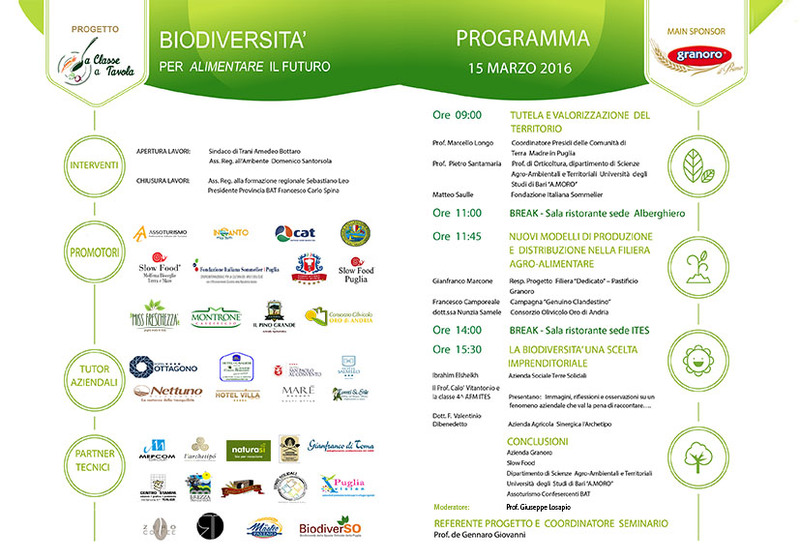 Oggi, martedì 15 marzo, dalle 9 alle 18 presso l’auditorium Scaringi dell’I.I.S.S. "Aldo Moro" di Trani, si terrà il Seminario dal titolo: "Biodiversità per alimentare il futuro".