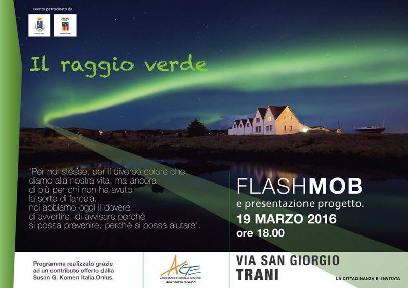 Oggi, sabato 19 marzo, a partire dalle 18, in via San Giorgio, si terrà l'evento di solidarietà "Il raggio verde". A comunicarlo, la presidente dell'A.Ge. (associazione genitori) di Trani, Anna Brizzi. Si tratterà di un flash mob che servirà ad offrire una visione della donna che vada ben oltre il ricordo e le manifestazioni solitamente previste per l’8 marzo.