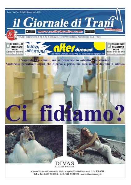 È in edicola il nuovo numero de Il giornale di Trani. Di seguito, alcuni degli argomenti trattati: Ospedale riconvertito: «Sarà meglio di prima»; Stp, grandi manovre; Utc, è l’anno zero; Turisti, dove i bus?; Addio Mons. Franco.