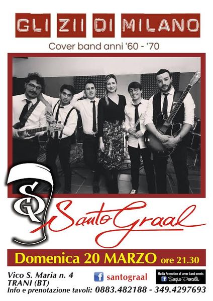 Oggi al Santo graal di Trani in vico Santa Maria 4 alle 21.30 «Gli zii di Milano» cover band anni '60 - '70. Da Battisti a Mina, da Nada a Gianni Morandi, i più grandi successi rivisitati in chiave moderna.