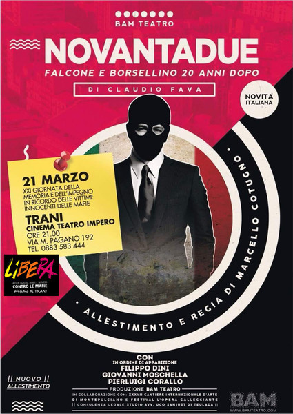 A ventiquattro anni dalla strage di via d’Amelio, per la prima volta le figure di dei due giudici simbolo della lotta alla mafia vanno in scena anche a Trani con lo spettacolo teatrale «Novantadue. Falcone e Borsellino, 20 anni dopo», proposto dalla compagnia Bam teatro oggi, lunedì 21 marzo, alle 21, al teatro Impero. Ne è autore Claudio Fava, figlio di Pippo Fava, giornalista d’inchiesta vittima della mafia. Allestimento e regia sono di Marcello Cotugno e, fra gli attori in palcoscenico, il tranese Pierluigi Corallo, che torna a recitare nella sua città natale a distanza di ventuno anni dall’ultima rappresentazione, quando muoveva i primi passi diretto da Mario Francavilla.