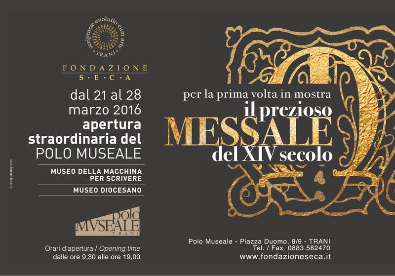 Ad arricchire questa importantissima occasione ci sarà, anche, l’esposizione del prezioso Messale del 1370 (XIV secolo), che, negli anni '70 veniva trafugato durante una mostra per poi essere recuperato dalla Guardia di finanza di Roma in una casa d’aste in Inghilterra: fu restituito alla diocesi nell’ottobre del 2011. Da allora lo storico manoscritto, dall’inestimabile valore e rifinito in oro zecchino, non è più stato esposto in pubblico. Il Messale, che potrà essere ammirato gratuitamente all’interno della corte del Polo museale, «rappresenta un’importantissima testimonianza della vetustà del culto del Santo patrono, Nicola il Pellegrino, della sensibilità liturgica e delle capacità artistiche dei nostri avi », aveva ricordato il vescovo, Giovan Battista Pichierri, in occasione della restituzione dello stesso. Ancora una volta, dunque, la Fondazione Seca regalerà un altro pregevole mix di storia, cultura e religione, finalizzato a rendere Trani sempre più polo d’attrazione turistica.