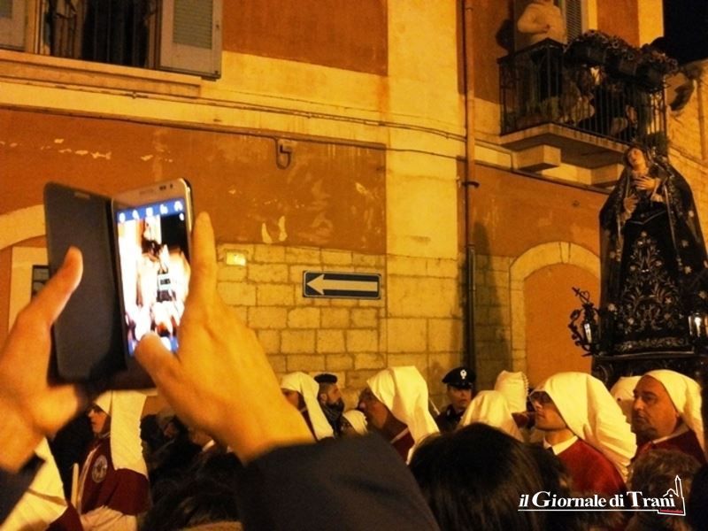 Alle 3, con partenza dalla chiesa di Santa Teresa, comincia la processione di penitenza dell’Addolorata, cui la cittadinanza tranese serba sentita e particolare devozione. Peraltro, si tratta di una delle processioni del periodo di Pasqua più suggestive di tutta la Puglia.