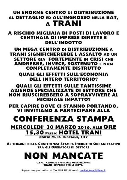 Di questo e di altro si discuterà nell’approfondimento che il Comitato Spontaneo Organizzatore Trani - imprese per la città, ha organizzato per il giorno mercoledì 30 marzo 2016, alle ore 15.30 all’Hotel Trani e proprio in queste ore è in divulgazione il volantino informativo di invito all’iniziativa.