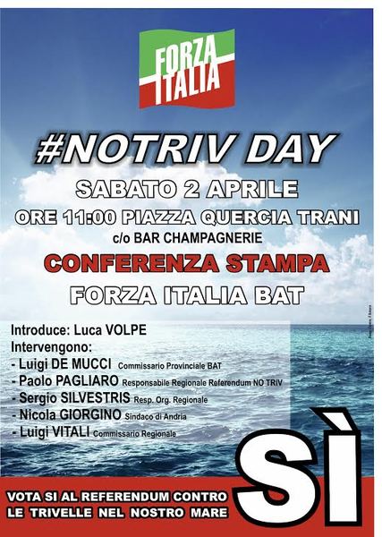 Domani, sabato 2 aprile, alle 11 presso il bar La Champagnerie in Piazza Quercia a Trani, Forza Italia Bat organizza una conferenza stampa per rendere pubbliche le manifestazioni in programma in occasione del #noTrivDay. La location che calza a pennello l'intento di difendere il nostro mare.