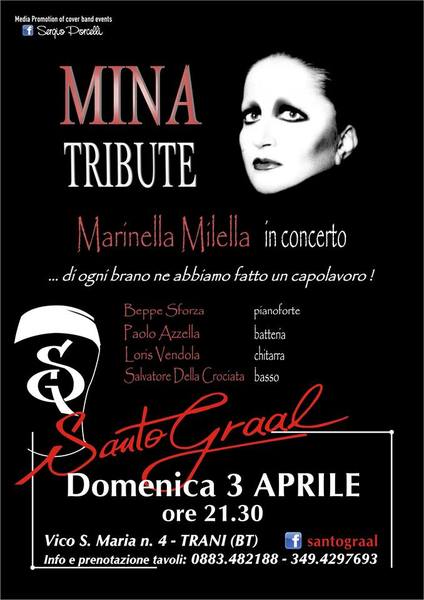 Sul palco del Santo Graal questa sera i "Tribute Mina". La band nasce nel 2015 dall'incontro di cinque musicisti provenienti da esperienze musicali differenti, ma accomunati dalla stessa passione per la cantante italiana. Voce di Marinella Milella, piano Beppe Sforza, chitarre Loris Vendola, basso Da Sal della Crociata, batteria Paolo Azzella.
