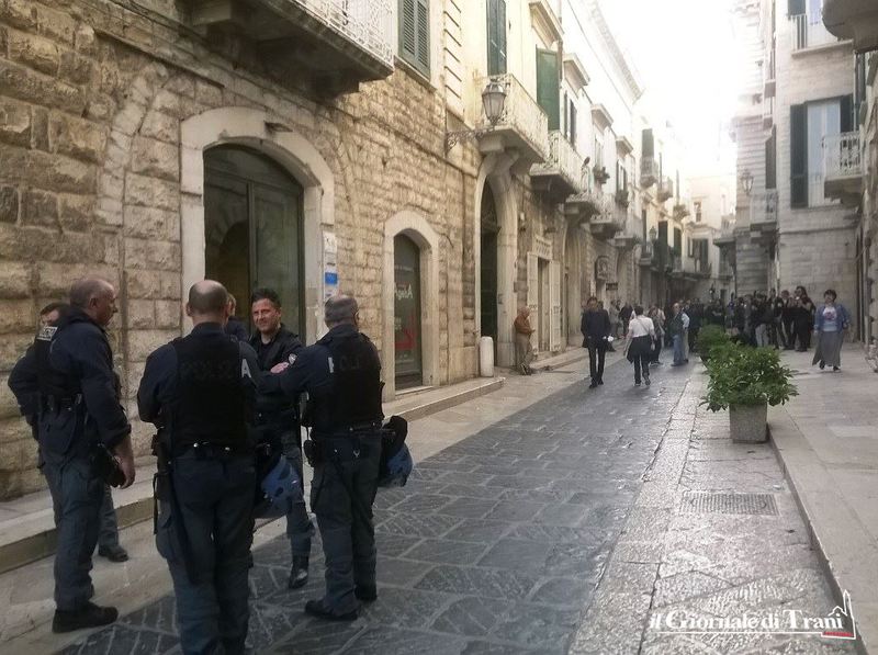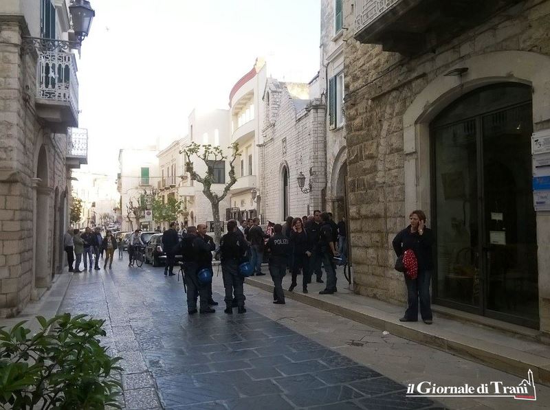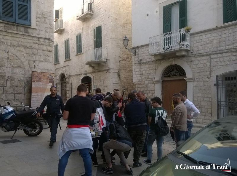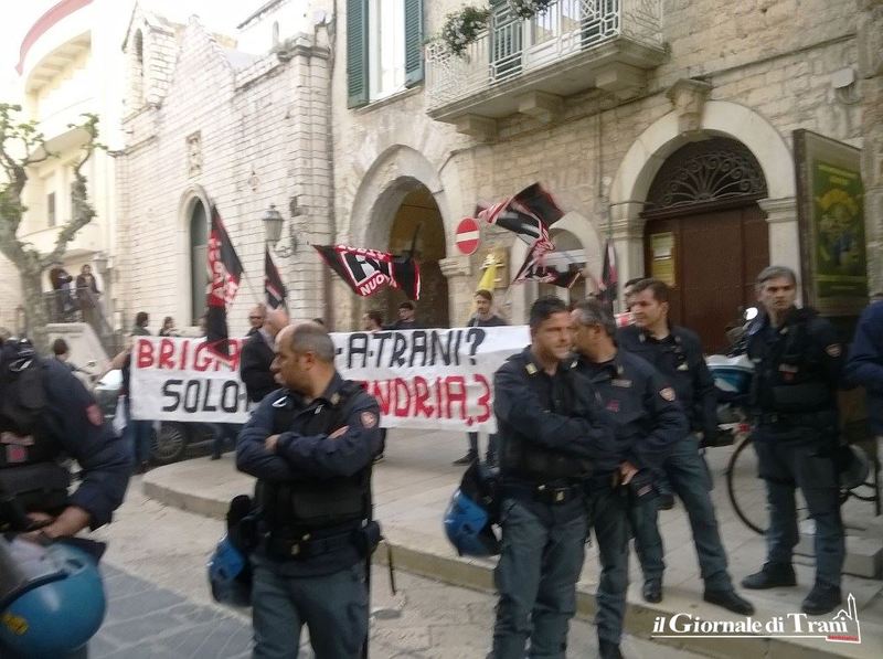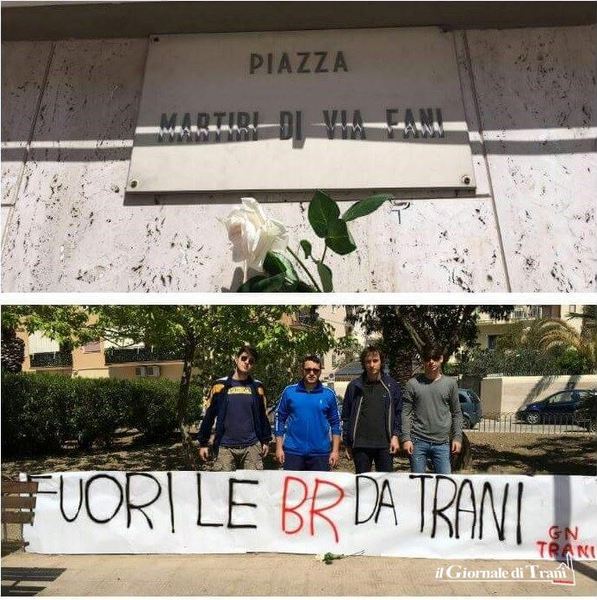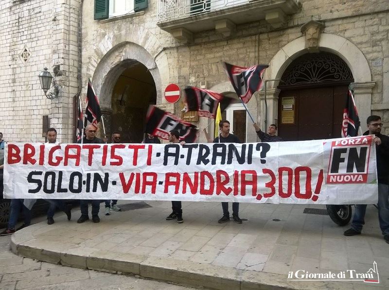 In una via Mario Pagano completamente chiusa al traffico e presidiata da decine di poliziotti in divisa ed in borghese, poi, i ragazzi di Forza Nuova, guidati da Vito Nicola Bruno Cantacessi e Mimmo Carlucci, rispettivamente membro dell’ufficio politico nazionale di Forza Nuova e coordinatore regionale di Forza Nuova Puglia, hanno esposto uno striscione con la scritta: «Brigatisti a Trani? Solo in via Andria, 300», con chiaro riferimento alla casa circondariale, dove tra l’altro molti brigatisti hanno scontato la loro pena e dove nel 1980 alcuni di essi organizzarono una rivolta, rimasta nella storia della nostra città.