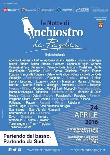 In un Paese dove si legge poco, nella regione agli ultimi posti per numero di lettori, qualcosa di grande prende corpo, cresce e si propaga, arriva a Milano, passando per Bari, Foggia, Ascoli. Anche quest’anno, il 24 aprile, nella tanto attesa notte di «Inchiostro di Puglia» 150 fortini letterari in 120 comuni ospiteranno circa 500 eventi letterari, grazie alla collaborazione di volontari operatori della cultura.