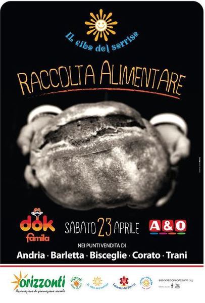 È un vero e proprio grido d’allarme accolto dall’Associazione Orizzonti, dal 2008 in prima linea nella lotta contro i disagi derivanti dalla povertà attraverso il recupero dello scarto alimentare ancora buono. I volontari, che da tempo denunciano la sempre più preoccupante situazione sociale cercando di aiutare con la distribuzione di cibo le tante famiglie sofferenti a causa della povertà, lancia una grande e importante iniziativa volta a sensibilizzare i consumatori di 5 comuni delle province Bari e Bat: oggi, sabato 23 aprile nei punti vendita DOK, A&O e FAMILA di Andria, Barletta, Bisceglie, Corato e Trani si svolgerà la Raccolta Alimentare “Il Cibo del Sorriso”. Sarà possibile donare uno o più prodotti alimentari non deperibili acquistati per la spesa settimanale e donarli in appositi contenitori presidiati dai volontari dell’Associazione Orizzonti.