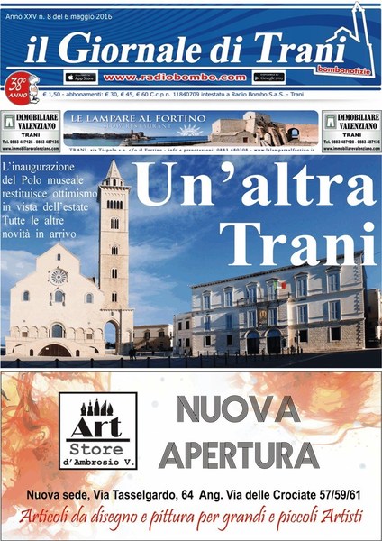 È possibile un'altra città, un'altra Trani, e il Polo museale lo dimostra, restituendo ottimismo in vista dell'estate. Di questo abbiamo scritto su Il giornale di Trani, in edicola a partire da oggi, in merito al Polo museale, il centro culturale che comprende il museo delle macchine per scrivere, quello diocesano e quello ebraico. All'inaugurazione era presente anche il sottosegretario di Stato Cesaro.