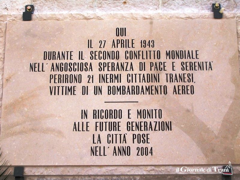 In un caso, e nell’altro, fu fondamentale la ricostruzione storica, sulle pagine del Tranesiere, del professor Raffaello Piracci, che conobbe la signora Domenica e ne portò avanti la battaglia «non per me e la mia famiglia – chiarì all’epoca la donna -, ma per la città, che aveva il diritto di sapere quello che accadde, che non doveva più ignorare il sacrificio di questi suoi figli morti anche loro da eroi. La mia vicenda vuole solo essere il simbolo di tante atrocità che la guerra ha prodotto e che i libri di storia non riportano. Questa lapide è un segno che rimarrà per sempre, perché Trani viva nella pace, la stessa che adesso alberga nel mio cuore dopo avere visto tanti miei sforzi produrre finalmente questo risultato».
